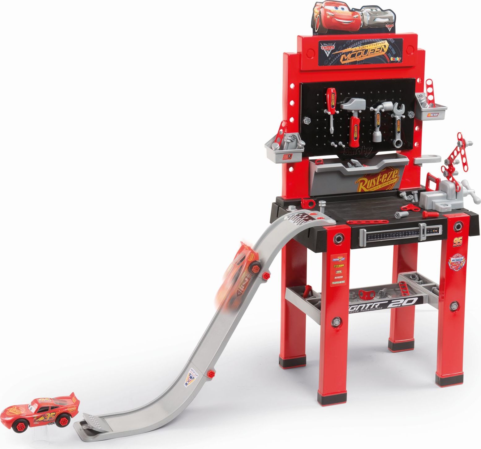 Pracovní dílna s oblíbeným Bleskem McQueenem k montáži/ demontáži. Blesk má i svou závodní dráhu. Bohaté přislušenství. Výška dílny 110 cm. Rozměry: 110 x 110 x 34 cm.