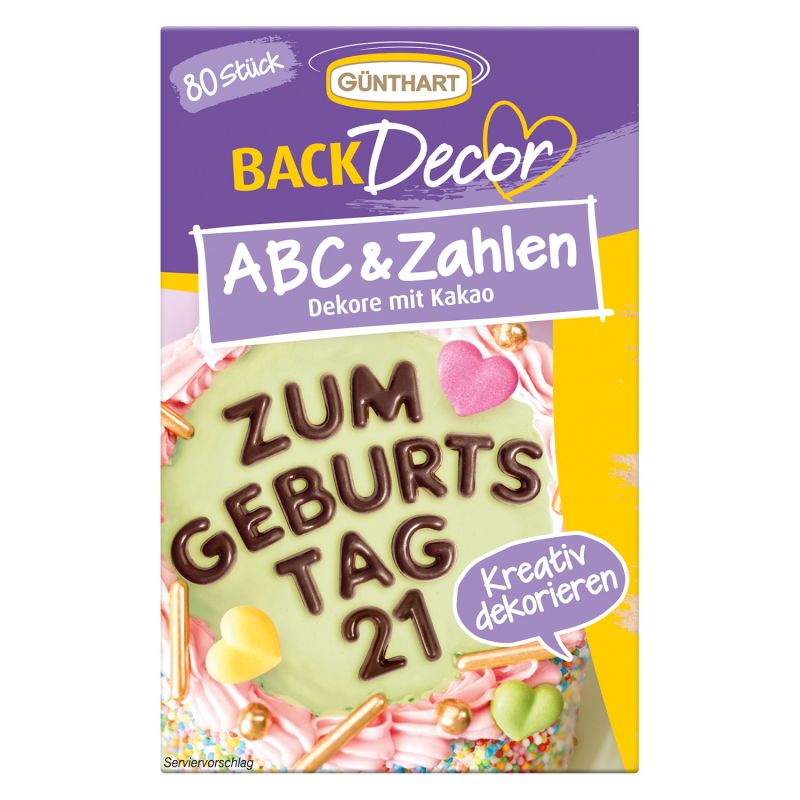 Dekorace ABC und Zahlen od značky Günthart jsou jedlé ozdoby z kakaové polevy, které umožní dortům, cupcakům a zákuskům dodat osobní a kreativní podobu. Ať už chcete vyjádřit jméno, věk nebo krátký nápis, písmenka a číslice se stanou skvělým pomocníkem při zdobení. Díky tmavému čokoládovému vzhledu působí elegantně a přitom hravě, takže se hodí na dětské oslavy, narozeniny i slavnostní příležitosti.