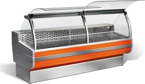 Chladicí vitrína obslužná s ventilovaným chlazením s čelním oblým sklem zvedacím s tlumiči.