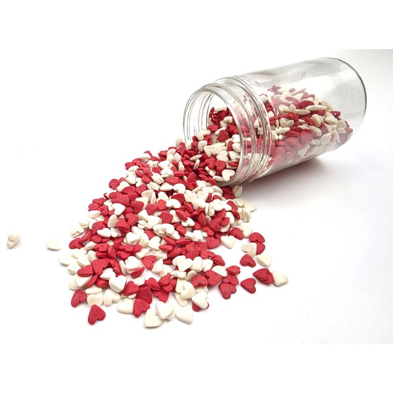 Cukrové posypky v podobě červených a bílých srdíček jsou perfektní ozdobou dortů, koláčů a dalšího pečiva. Jemná perlová srdíčka dodají kouzlo a romantickou atmosféru každé kompozici dezertu. Díky nim můžete vyjádřit lásku a srdečnost jedinečným a vkusným způsobem. Konfetové cukrové posypky perleťová růžová srdíčka jsou perfektní pro zdobení dortů k různým příležitostem, jako jsou narozeniny, Valentýn, zásnuby nebo výročí, dodávají jim jedinečné kouzlo a eleganci.Pokud zdobení nasypete na vláčný krém, vlhkost z něj může posypek změkčit. Ale pozor, pokud bude zdobení na vlhkém krému delší dobu, může se z posypku uvolnit i barvivo a to na povrch krému. Pokud chcete, aby větší části dekorace drželi například na potahovém dortu, můžete tento druh zdobení k dortům lepit polotuhou čokoládou, nebo glazurou na perníčky. s posypky pracujte nejlépe nad miskou, či plechem s okrajem.