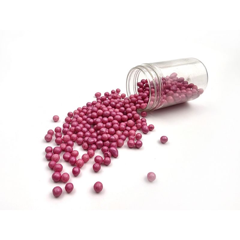 7 mm velké tmavě růžové perly jsou vyrobené z rýžových lupínků a cukru. Jsou perfektní na zdobení dortů, zmrzliny, zákusků a perníčků. Objevte kouzlo těchto perel, které promění každý dezert v umělecké dílo. Jsou více než jen dekorace - jsou to drobné akcenty, které dodávají lesk a jedinečnost vašim sladkým výtvorům. Jsou vyrobené z nejkvalitnějších surovin. Jejich povrchová úprava je inovativním přístupem k dekoraci, která vyčnívá z tradičních jedlých ozdob. Pokud zdobení nasypete na vláčný krém, vlhkost z něj může posypek změkčit. Ale pozor, pokud bude zdobení na vlhkém krému delší dobu, může se z posypku uvolnit i barvivo a to na povrch krému. Pokud chcete, aby větší části dekorace drželi například na potahovém dortu, můžete tento druh zdobení k dortům lepit polotuhou čokoládou, nebo glazurou na perníčky. s posypky pracujte nejlépe nad miskou, či plechem s okrajem.