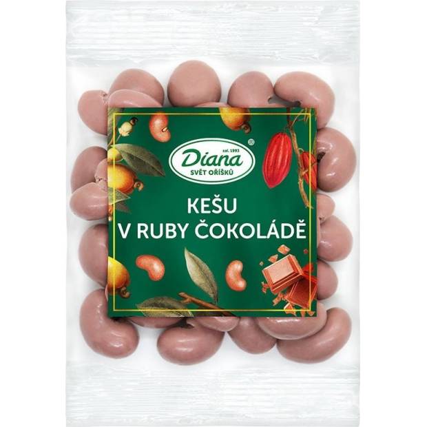 Složení: ruby čokoláda 63 % (cukr, kakaové máslo, sušené mléko plnotučné, kakaová hmota, emulgátor sojový lecitin E322, kyselina citronová E330, přírodní vanilkové aroma), kešu 35 % (kešu, slunečnicový olej), 1,9% leštící činidla (glukózový sirup, arabská guma E414), 0,1% šelak E904 Nutriční hodnoty ve 100 g: energie 2388 kJ/574 kcal, tuky 39,6 g (z toho nasycené 17,1 g), sacharidy 44,6 g (z toho cukry 34,9 g), vláknina 1,5 g, bílkoviny 9,2 g, sůl 0,15 g