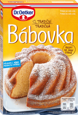 Vzpomeňte na babiččin nedělní stůl - k němu neodmyslitelně patří bábovka. Vždy byla vynikající a voňavá. A co teprve, když je vlastnoručně upečená - a přitom s tak jednoduchou přípravou! Kombinací jedinečné receptury, kvalitních surovin pečící směsi Bábovka Dr. Oetker a přidáním pouze vody a oleje docílíte velmi jednoduše a rychle vlastnoruční přípravy tradičního moučníku. Tento moderní způsob domácího pečení je perfektní zárukou úspěchu Vašich moučníků. Balení obsahuje: 600 g směsi na těsto K tomu přidáte: 350 ml vody, 120 ml oleje (12 polévkových lžic) Příprava: Obsah sáčku se směsí na přípravu těsta vysypeme do mísy a přidáme odměřenou vodu a olej. Vše důkladně promícháme ručně nebo elektrickým ručním šlehačem dohladka. Těsto vylijeme do vymazané a moukou vysypané bábovkové formy (průměr 23 cm) a dáme péct na 60-70 minut (elektrická trouba 160°C, horkovzdušná trouba 140°C, plynová trouba střední stupeň). Pokud chceme mít jistotu, že je bábovka již upečená, píchneme doprostřed těsta špejlí. Pokud se na ni těsto nelepí, bábovka je hotová. Po upečení necháme bábovku vychladnout a opatrně ji vyklopíme. Složení: pšeničná mouka, cukr, dextróza, kypřicí látky (dihydrogendifosforečnan sodný, hydrogenuhličitan sodný), lupinová mouka, sušené odtučněné mléko, jedlá sůl, aroma, vláknina, barvivo (kurkumin). Může obsahovat stopy vajec. Nutriční hodnoty ve 100 g: energie 1269 kJ/302 kcal, tuky 12 g (z toho nasycené 1,3 g), sacharidy 44 g (z toho cukry 20 g), bílkoviny 4,4 g, sůl 0,58 g