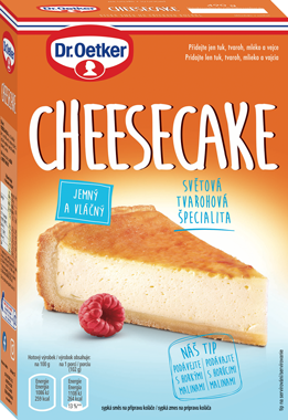 Dr.Oetker vyvinul Cheesecake podle české chuti a zvyklostí tak, aby hospodyně s co nejmenší námahou vykouzlila koláč, který se určitě podaří a bude chutnat celé rodině. Recept se směsí Dr.Oetker Cheesecake je velice jednoduchý. Balení obsahuje: 330 g směsi na těsto, 160 g směsi na náplň K tomu přidáte: Na těsto - 180 g másla nebo margarínu. Na náplň - 500 g polotučného tvarohu, 300 ml polotučného mléka, 3 vejce (velikost M). Příprava: Obsah sáčku se směsí na přípravu těsta vysypeme do mísy nebo na pracovní desku. Přidáme máslo nebo margarín a ručně vypracujeme dohladka. Těsto naneseme do vymazané formy (26 cm). Přitlačíme ke dnu formy i po okrajích tak, abychom vytvořili okraj vysoký asi 3 cm. Těsto vidličkou na několika místech propícháme. Na přípravu náplně smícháme obsah sáčku se směsí na náplň s tvarohem, mlékem a vejci. Metličkou vymícháme dohladka a nalijeme na těsto. Dáme péct na 80-90 minut (elektrická trouba 160°C, horkovzdušná trouba 150°C, plynová trouba střední stupeň). Po dobu pečení troubu zbytečně neotvíráme. Po upečení necháme cheesecake úplně vychladnout.