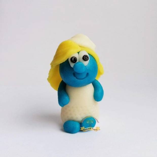 Ručně modelovaná 3D postavička Šmoulinky. Na výrobu byla použita modelovací kokosová hmota s příchutí a aroma sladkých mandlí. Lze s ní ozdobit dorty, rolády, zákusky a další.