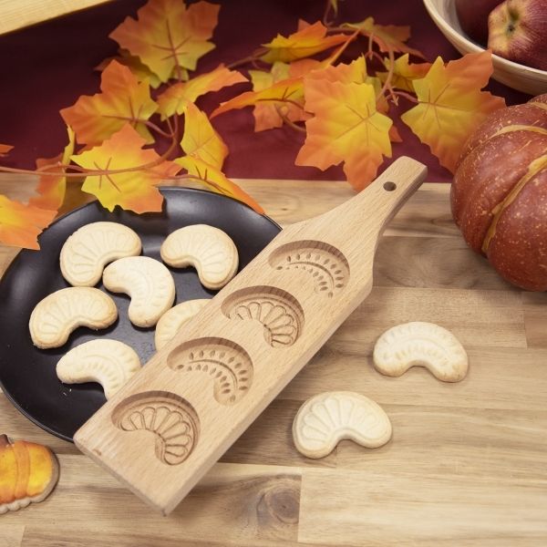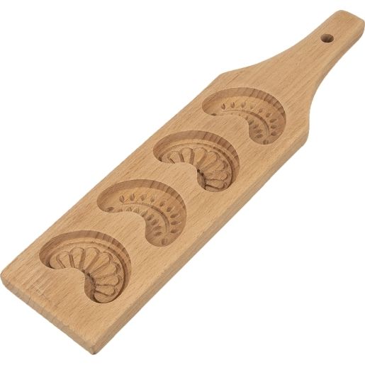 Formička na výrobu vytlačovaného cukroví/perníčků může být nejen funkčním pomocníkem, ale také dokonalou dekorací. Těsto namačkáte do formiček, vyklopíte na plech a upečete. Využít ji můžete také na tvarování másla, keramické hlíny… Materiál: bukové dřevo. 4 tvary. Rozměry: 7x30,5x1,5 cm, d. rohlíčku 5,5 cm, hl. 0,4 cm.