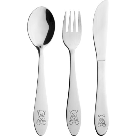 Dětský příbor s dekorem medvídka. Obsahuje 3 ks - lžíci, vidličku a nůž. Materiál: kvalitní nerez. Tvar přizpůsobený dětem. Lze mýt v myčce na nádobí. Rozměry: (délka/šířka) lžíce 15,5/3,5 cm, vidlička 15,5/2,5 cm, nůž 17/2 cm.