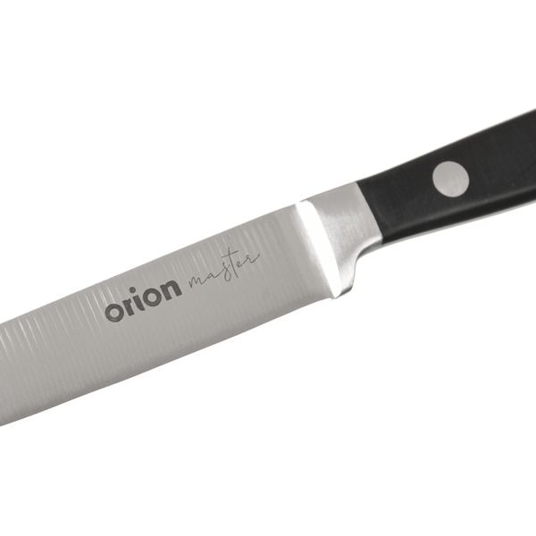 Kuchyňský nůž z kolekce Master pro profesionální využití. Bude se hodit i pro vášnivé amatérské kuchaře, domácí gurmány a labužníky. Robustní čepel je opatřena štíhlým ostřím. Krájení je snadné, přesné, dokonalé. Ostrost v celé délce čepele vydrží při správném zacházení velmi dlouho. Nýtované rukojeti z vysoce kvalitního plastu mají zaoblené hrany a skvěle padnou do ruky. Dokonalé slícování jednotlivých částí brání zachycování usazenin a bakterií. Materiál: nerezová ocel 430 (tvrdost 56 HRC – podle Rockwella), rukojeť - plast ABS se třemi nerezovými nýty. Rozměry: celková délka nože 23,5 cm, čepel 12,5 cm, ostří 12,5 cm. Po umytí v myčce dobře vysušte. Častým používáním myčky dochází k postupnému tupení ostří – doporučujeme ruční mytí, které je vůči nožům šetrnější i rychlejší. Nůž máte ihned opět k dispozici a nemusíte čekat na celý mycí cyklus myčky. Široký výběr tvarů nožů z kolekce Master.