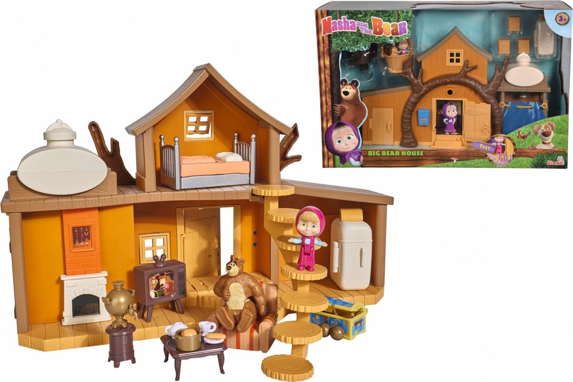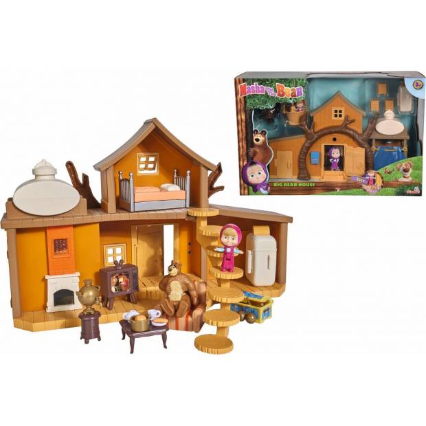 Velký dvoupodlažní dům medvěda z oblíbeného dětského seriálu "Máša a medvěd". Součástí figurka medvěda i Máši, lanovka a bohaté příslušenství. Se zvukovým efektem. Rozměry rozloženého domečku: 11 x 35 x 22 cm (dxhxv).