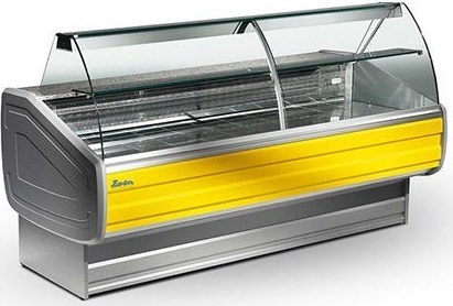 Chladicí vitrína obslužná ventilovaná s čelním sklem tvrzeným výklopným.