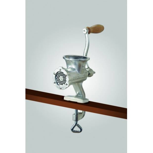 "Litinový mlýnek se silnou vrstvou zdravotně nezávadného cínu je opatřen řeznou deskou na jemné mletí (průměr otvorů je 0,4 cm). Dá se připevnit na pracovní desku o maximální tloušťce 4 cm pomocí šroubu, který je zakrytý gumovou vrstvou bránící poškrábání pracovní desky. V mlýnku můžete mlít veškeré druhy masa. Řeznou desku je možné vyměnit (další řezné desky nejsou součástí balení). Klička na mletí je vyrobená ze dřeva pro příjemnou manipulaci. Mlýnek nelze mýt v myčce.