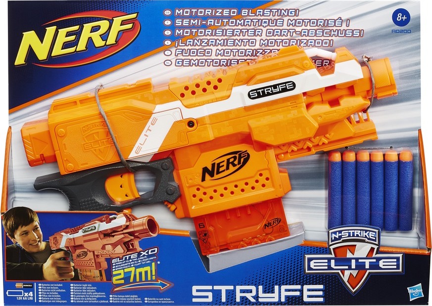 Bleskově zdolejte cíle s rychlostí motorizované pistole! Nová zbraň Nerf N-Strike Elite Stryfe disponuje zásobníkem se 6 šipkami a umožní střílet jednou rukou. Podržte akcelerační spoušť pro zapnutí motoru, uvolněte a překotnou rychlostí zasáhněte cíl všemi 6 šipkami najednou. Rychle dobijte pomocí rychloupínacího klipu, který drží všch 6 šipek pohromadě. Nová pistole Stryfe má kompaktní velikost, na bojišti svému majiteli nepřekáží a je nepostradatelným doplňkem bojovníka na každé misi. V balení 6 Elite šipek.
