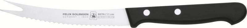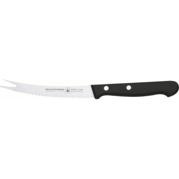 Vroubkovaná čepel ze směsi vanadu, molybdenu a chromu umožní dokonale nakrájet rajčata bez drcení a vymačkávání šťávy. Čepel rajčetem snadno proklouzne a vy můžete rajčata krájet na opravdu tenké plátky. Vidlice na špici umožňuje nabírat menší rajčátka nebo drobné odřezky. Čepel je ručně kovaná. Délka čepele je 11 cm. Délka nože: 21,5 cm. Hmotnost: 0,01 kg.