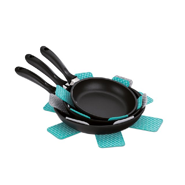 Tato ochranná podložka z plsti v tyrkysové barvě ochrání vaše pánve a rozzáří interiér vaší skříňky, stolu, zásuvky. Vyrábí se v různých barvách a třech velikostech. Ochráníte tak nejen pánve, ale i hrnce různých velikostí. Vaše skříňky jsou chráněny pře