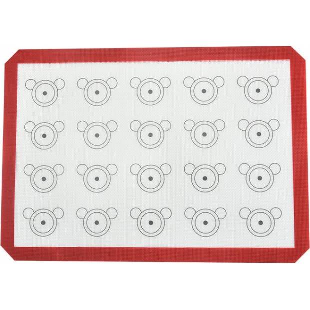 Nepřilnavá pečicí podložka na makronky. Podložka na těsto je označena kolečky, takže pokaždé můžete rozložit to správné množství směsi pro jednotné části makronek. Malý kruh ukazuje, kam umístit trysku trubičky - stačí naplnit šablonu směsí, dokud nedosáhne hranice velkého kruhu. Šablona je také skvělá pro výrobu pevných pusinek nebo dokonce obřích čokoládových knoflíků. Nepřilnavá podložka na pečení makronek je velmi tenká a pružná, ale také velmi odolná.