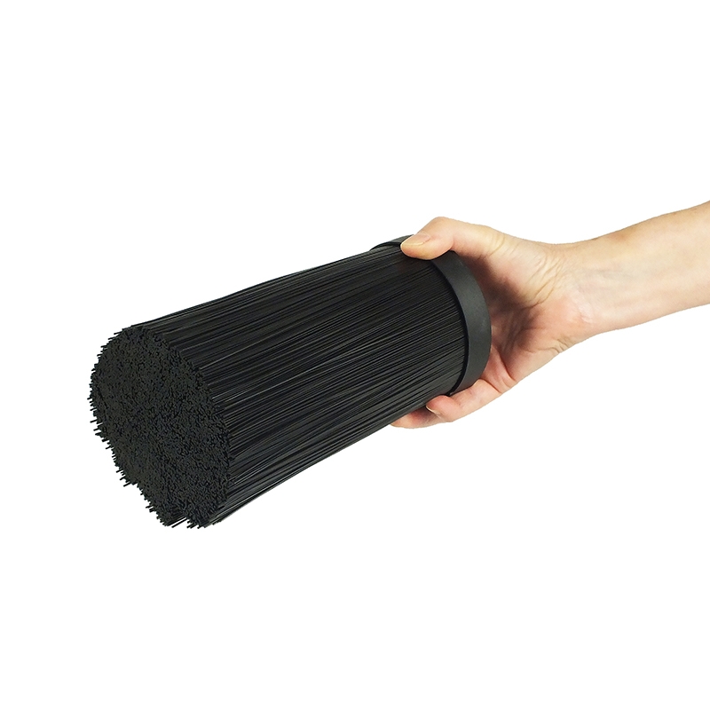 Samostatně stojící držák kuchyňských nožů vyrobený z šedého plastu. V držáku je pět nožů s ocelovou čepelí a černou plastovou rukojetí. Uvnitř držáku jsou tenké plastové tyče, které umožňují libovolné umístění nožů a zabraňují poškození ostří.
