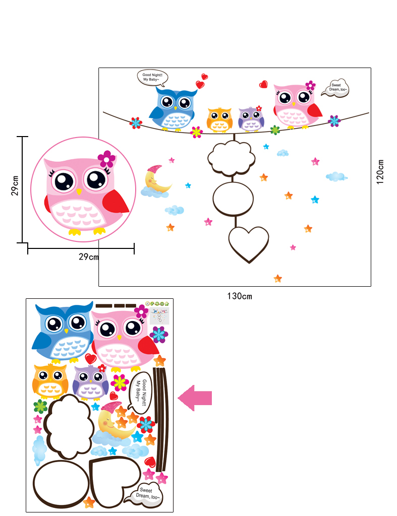 V balení vždy najdete několik částí, které nejsou spojené dohromady, a proto je můžete rozmístit dle vlastní fantazie. Udělejte tak radost svým dětem a překvapte je veselými samolepkami, které zútulní jejich království. Tento vzor „Sovičky“ si vaše ratolesti určitě oblíbí.