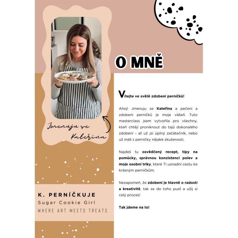Objevte svět moderního zdobení perníčků s Kateřinou Volanskou, zakladatelkou značky SugarCookie Girl a garantkou kategorie Zdobení perníčků. Její SCG Masterclass je komplexní e-book, který vás provede celým procesem – od přípravy těsta, přes tvorbu dokonalé polevy, až po ty nejjemnější detaily dekoru. Naučíte se techniky, díky nimž budou vaše perníčky nejen krásné, ale i precizní a profesionální.
