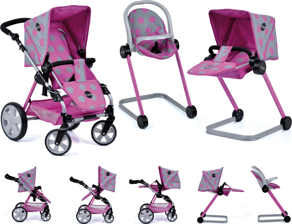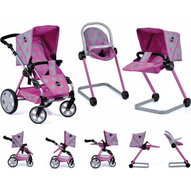 Kombinace kočárku, sportovního kočárku a autosedačky s polohovací rukojetí pro panenky do velikosti 43cm. Rozměry kočárku 63x38x65cm, šířka sedáku kočárku 20cm a sedačky do auta 17cm. Výška madla je nastavitelná od výšky 40-66cm. Vnitřek kořárku je polohovatelný. Průměr koleček předních 12,5cm, zadních 20cm. Ve spod kočárku je košík na drobnosti a stříška. Doporučený věk 3+