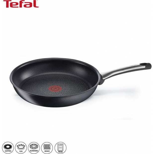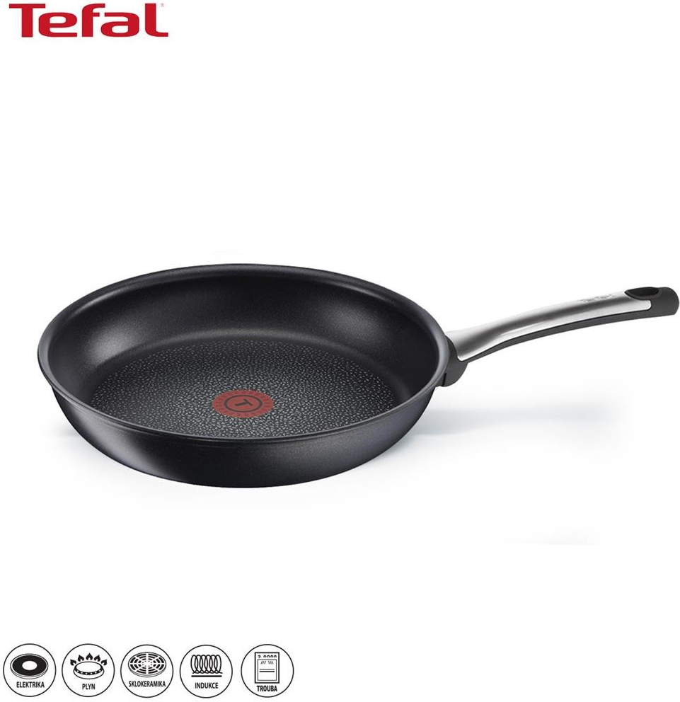TalentPro pánev Tefal má nový nepřilnavý povrch Titanium Excellence®, který je šestivrstvý s tvrdou minerální bází a vytvrzený patentovaným procesem fúze a dvěma vrstvami obohaceným titanem. Pánve Tefal jsou opatřeny indikátorem teploty, který signalizuje dosažení správné nahřátí. Pokrm se při teplotě 180 stupňů Celsia nespálí a zároveň je dobře uvařený. Tento model má velmi hezký design, který dotváří kvalitní nerezová rukojeť. Silné sendvičové dno má výbornou tepelnou vodivost, navíc zabrání deformacím pánve v průběhu používání. Je doporučeno pánev mýt ručně. Při vaření je však možné používat i kovové kuchyňské náčiní. Připravovat v ní můžete jakékoliv pokrmy na indukci, elektřině, plynu i v troubě. Vaření je snadné, bez velkého množství tuku. Nádobí Tefal vám přinese radost z vaření.