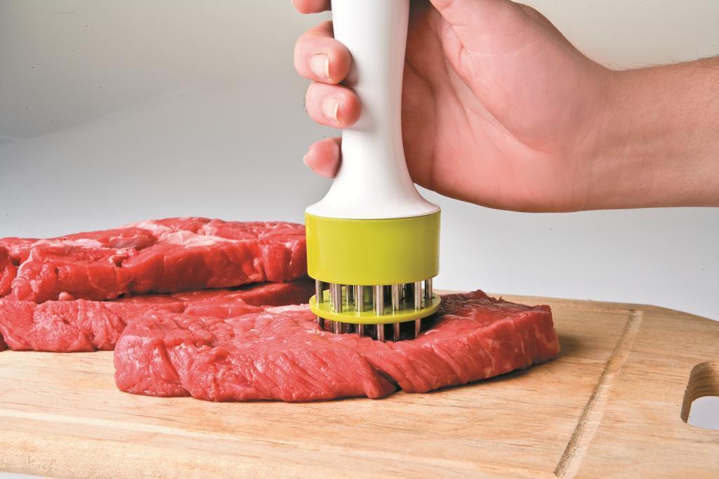 Moderní doplněk určený pro změkčování masa. Z plastového krytu se vysouvají nerezové jedlice, kterými se propichuje maso, dodává se mu vzdušnost, přerušují vlákna a zajišťuje se tak dokonalé propečení. Výrobek je zhotoven z nerezové oceli 18/8.