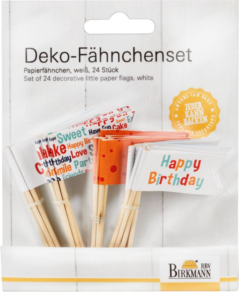Ozdobné vlaječky s nápisem Happy birthday jsou nelepeny na tenké špejli. Lze je zapíchnout do měkkého pečiva, vložit do šálku s kávou, apod.