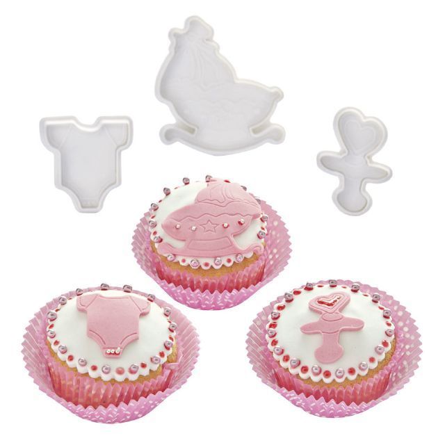 Sada 3 ks plastových pístových vykrajovátek - dětské motivy . Zdobení dortů nebo zákusků je snadné. Vykrajovátko položíte na rozválenou hmotu, tvar vykrojíte bez stlačení pístu - pouze přimáčknutím obvodu vykrajovátka. Vykrojený tvar zůstane uvnitř a pomocí pístu jej vymáčknete ven. Pomocí vykrajovátka můžete přímo zdobit dort - vykrajovátko s vykrojeným tvarem přiložíte na povrch dortu a jen stlačíte píst.